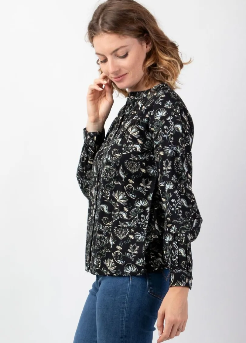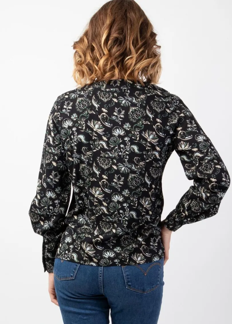 Joli chemisier classique manches longues au motif ethnique cachemire noir, très confortable pour commencer la saison automnale. Avec sa coupe droite facile à porter et ses fins liserés ajourés qui structurent avec féminité la patte de boutonnage, le chemisier Joe se portera pour aller au bureau ou pour une soirée festive.