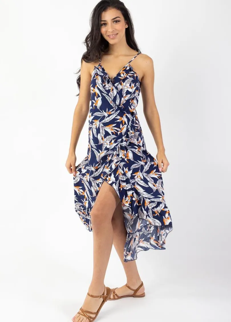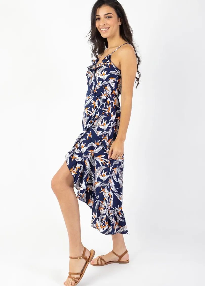 Hot Coton Du Monde Robe longue fines bretelles SACHA imprimé fleurs de paradis 14 Marine