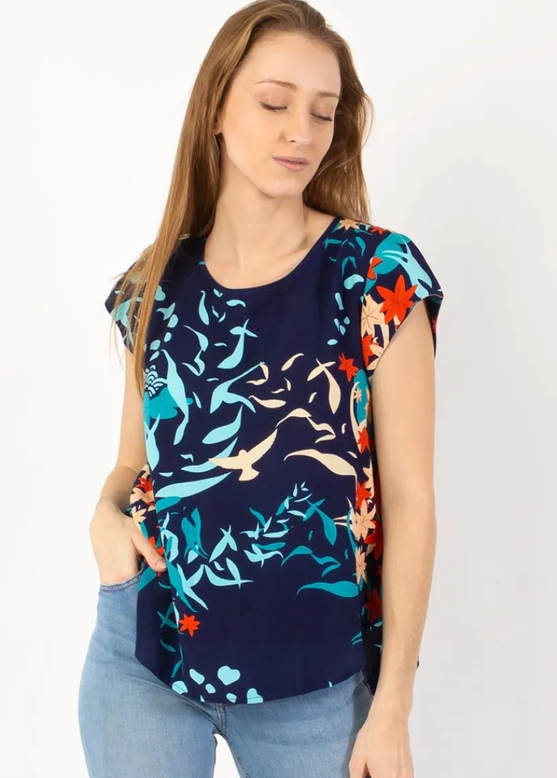 Magnifique top manches courtes en viscose. Sa coupe droite un peu ample et son encolure arrondie font de ce top une valeur sûre. Son motif ethnique marine nous invite au voyage. On aime la base de ce top légèrement plus longue dans le dos.