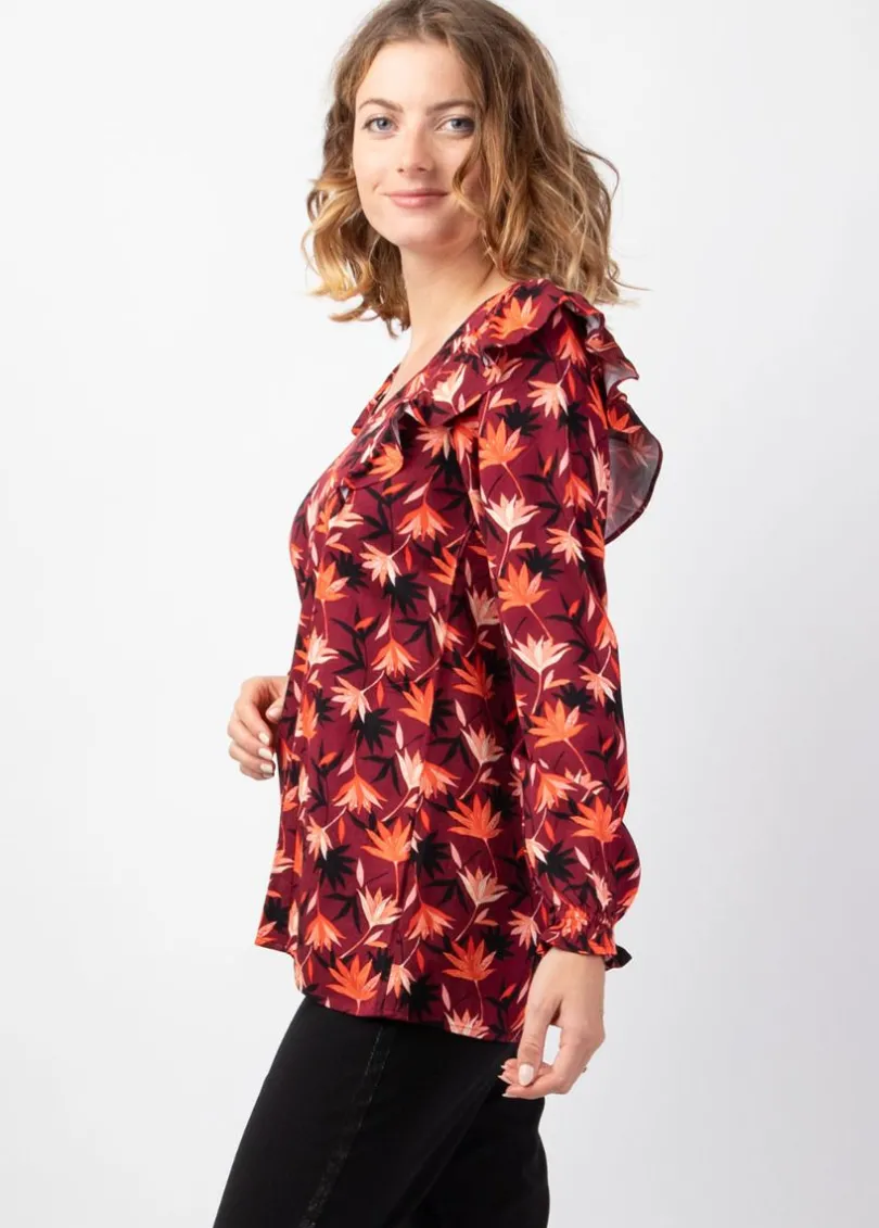Blouse manches longues hiver à la coupe ample et au superbe imprimé fleuri grenat lumineux et agréable à porter. Dotée de volants pour une touche romantique chic, cette pièce conviendra au quotidien avec un pantalon basique noir ou un jean.