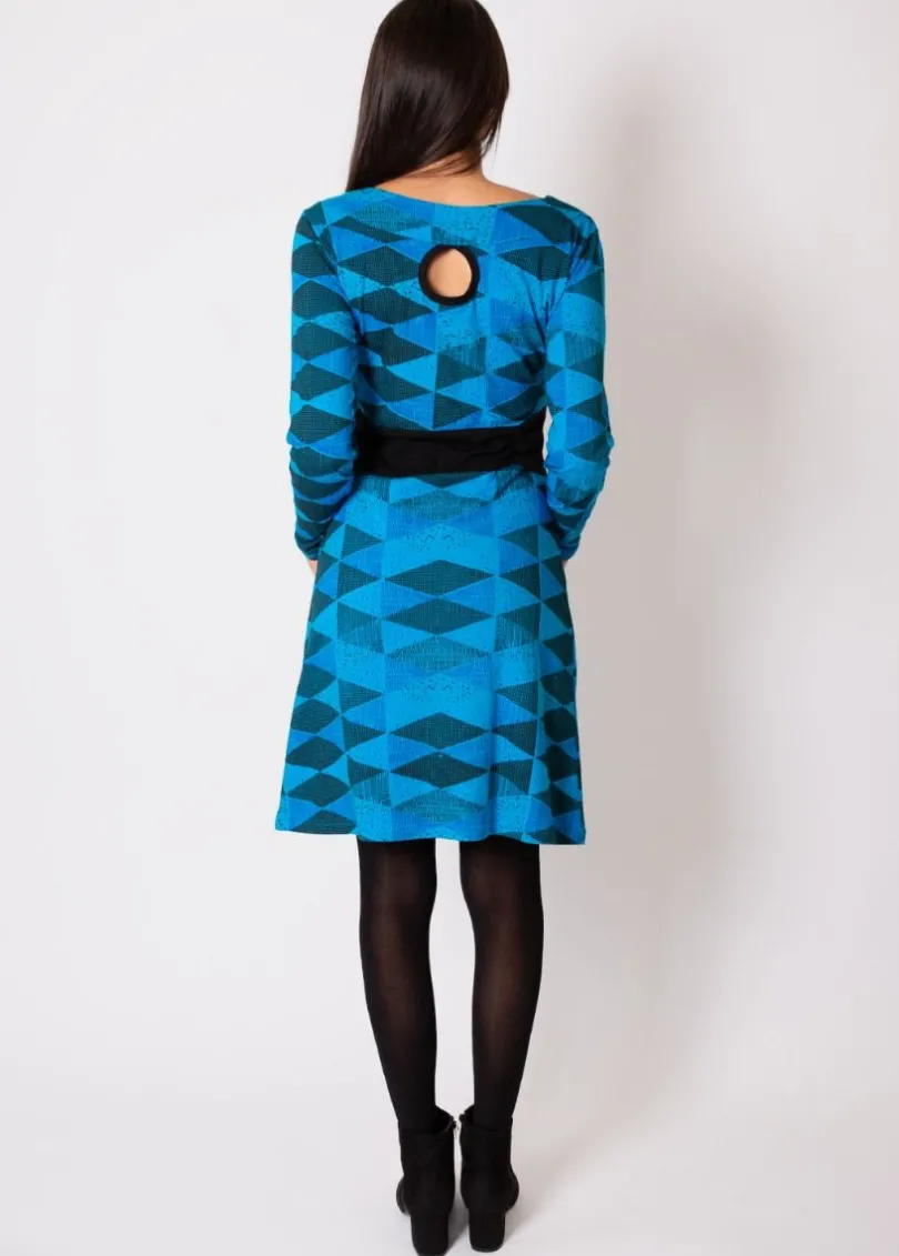 Cette robe en coton aux imprimés graphiques bleus sera idéale pour une soirée, ainsi vous pourrez associer ses coloris à un perfecto noir et des collants opaques.