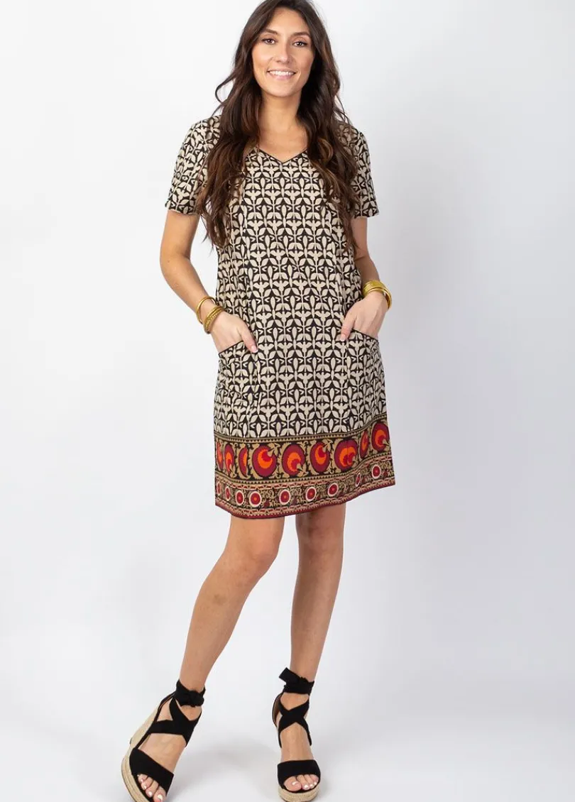 Idéale pour toutes les morphologies, cette robe courte en 100% coton et aux magnifiques imprimés ethniques soulignera avec simplicité votre silhouette. On aime sa coupe droite, ses manches courtes, ses poches profondes sur le devant de la robe ainsi que la légère ouverture fantaisie en haut du dos. L’imprimé africain avec la finition coloré au bas de la robe apporte de la gaieté à votre tenue.