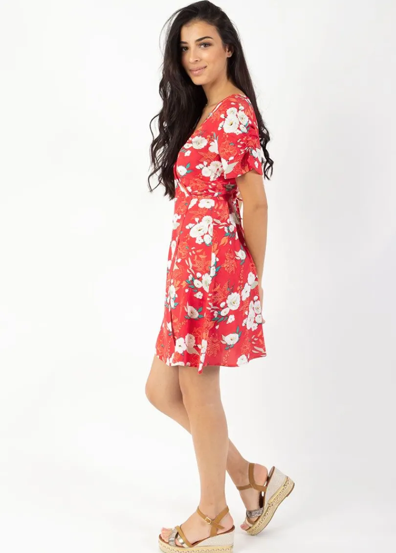 Robe courte rouge cache-coeur agrémentée d’un magnifique motif floral mode.
