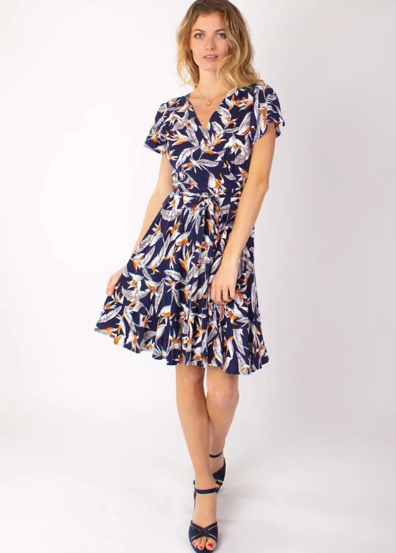 Outlet Coton Du Monde Robe courte MARIKA fluide cache-cœur imprimé fleur de paradis 14 Marine