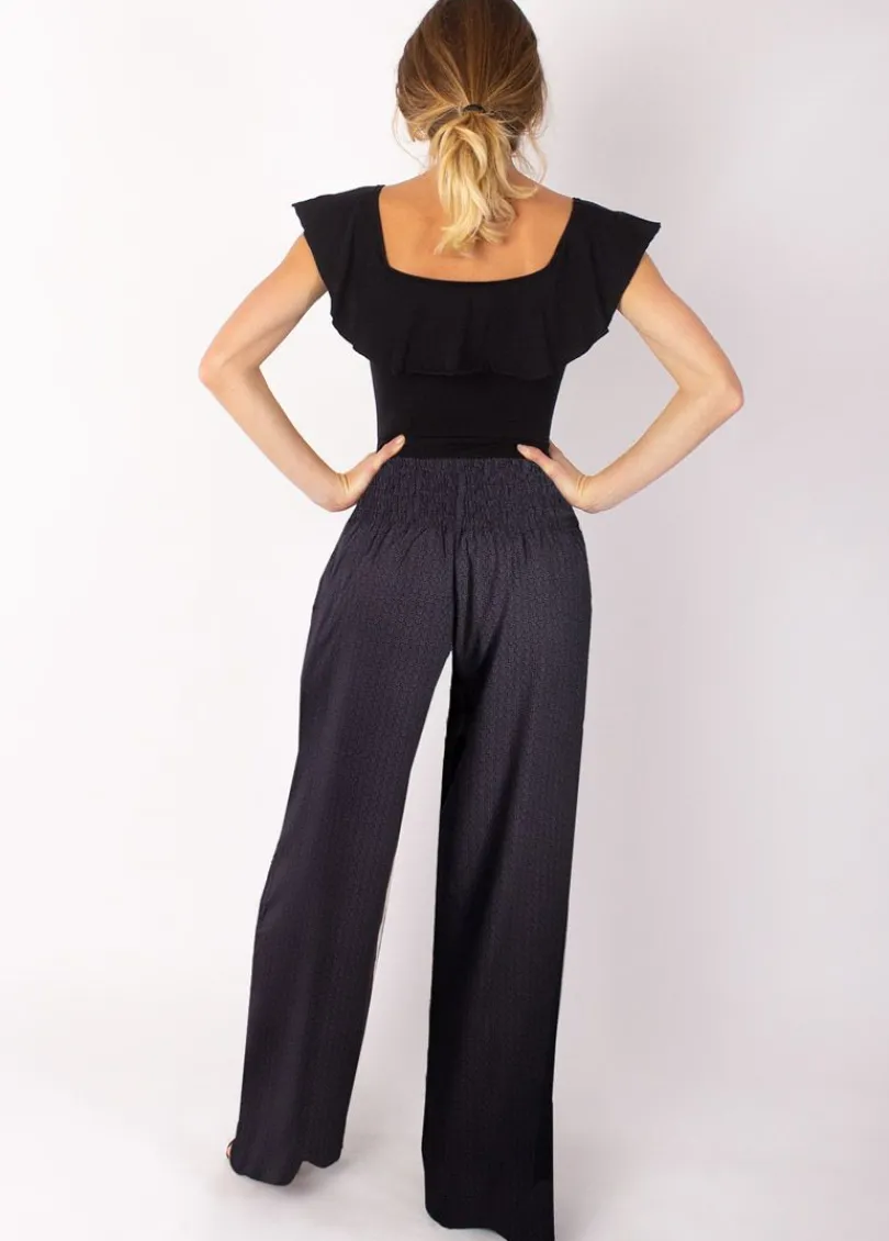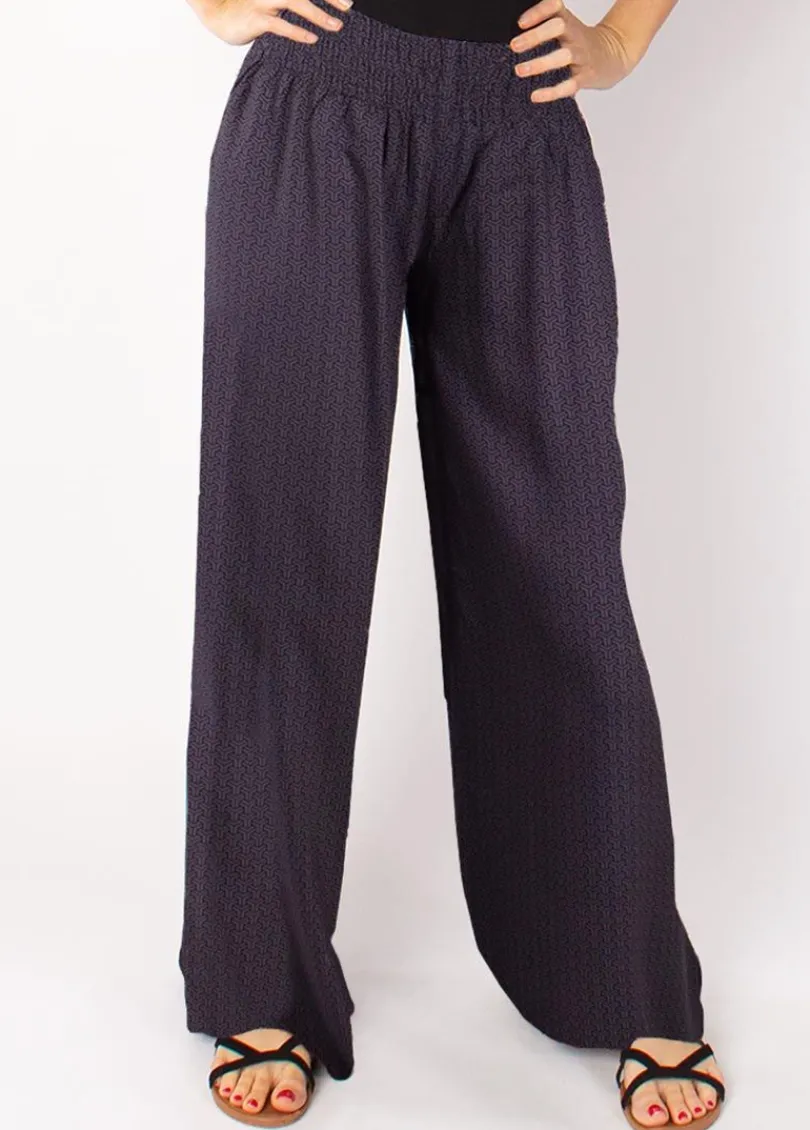 Pantalon en viscose fluide et léger à jambes larges très confortables. Agrémentez-le d’un joli top uni qui fera ressortir son petit motif ethnique gris/noir très tendance. Avec sa ceinture élastiquée, ce pantalon ethnique convient à toutes morphologies.