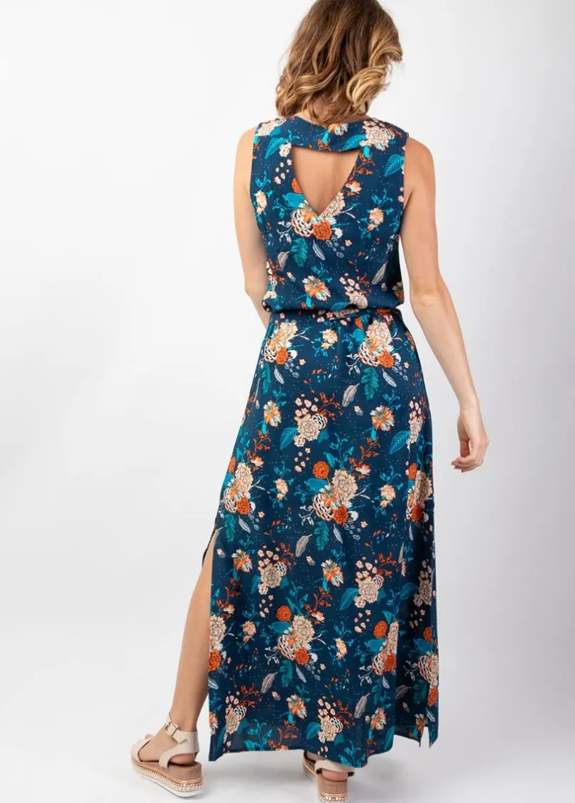 Robe longue simple et élégante à porter au quotidien et pour toutes occasions. Cette robe longue fleurie a tout les critères pour souligner votre féminité: col v, fendue sur les deux côtés, découpe fantaisie en haut du dos….