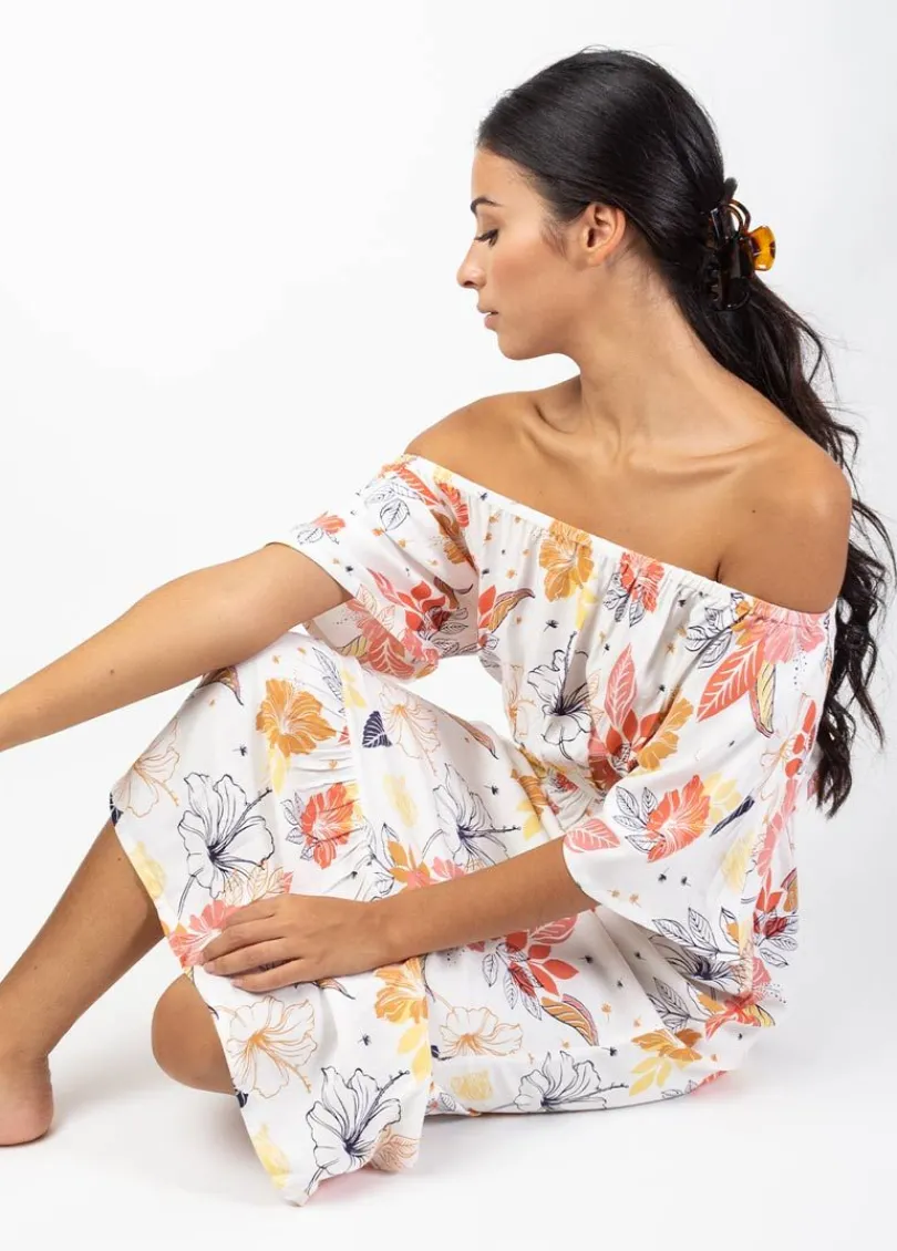 Shop Coton Du Monde Robe longue chic DALIA col bardot imprimé fleuri blanc Althea