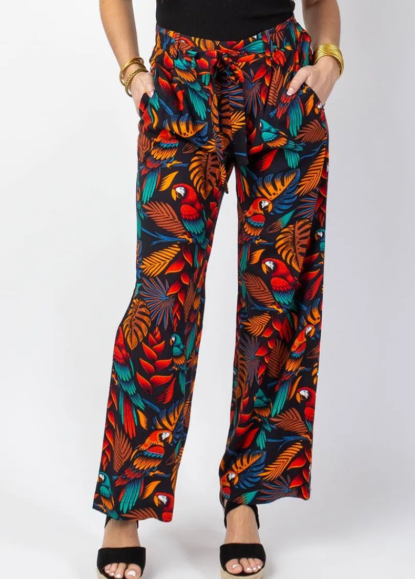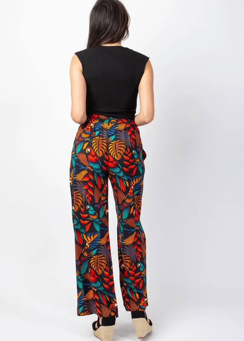 Pantalon tendance et très confortable avec ses jambes larges et sa matière fluide et légère. Facile à porter, le pantalon Mélody convient à tout type de morphologie. On craque pour son motif ethnique tropical sur fond noir avec de superbes perroquets colorés!