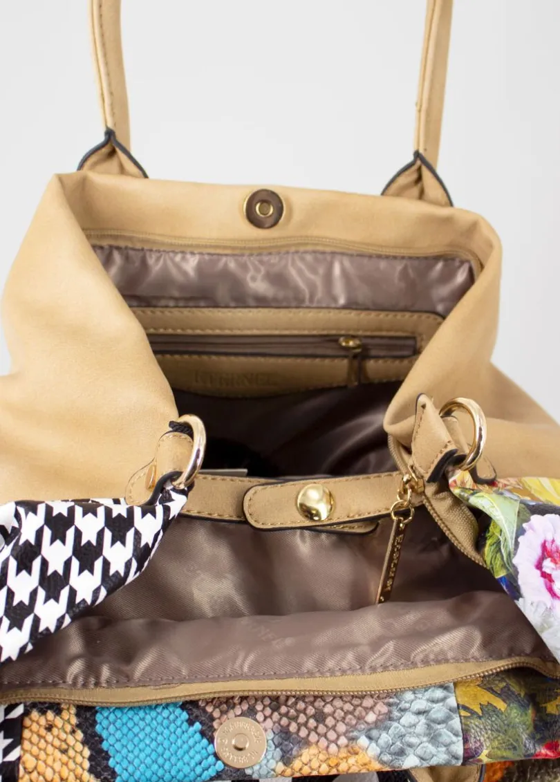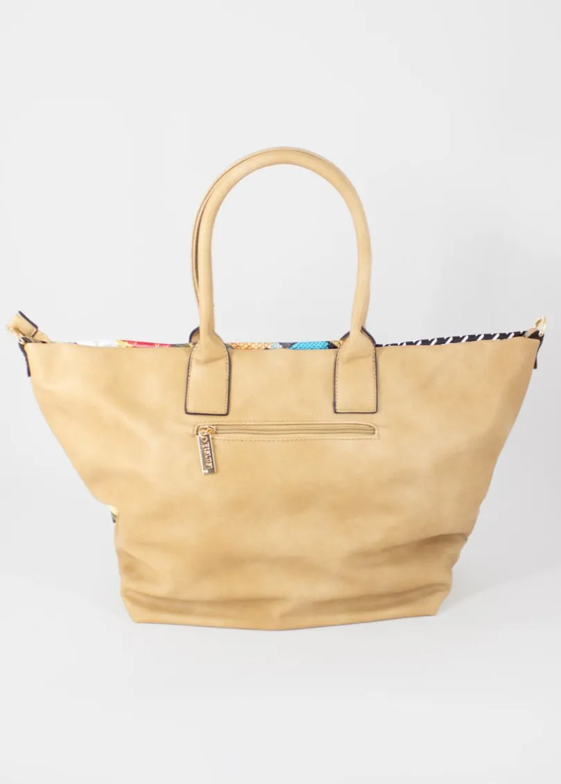 Profitez de ce joli sac aux imprimés patchwork (dos uni beige).
